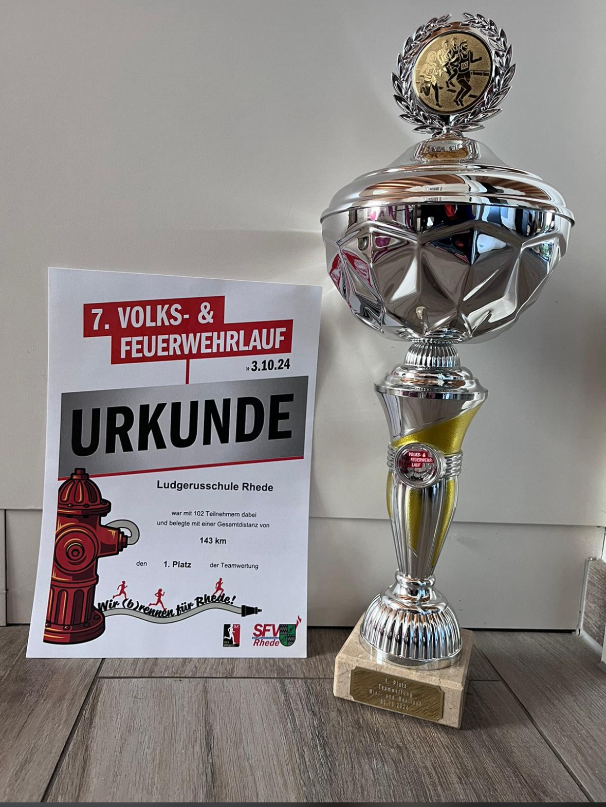 Am 3.10.24 fand der Feuerwehrlauf in Rhede statt. Unsere Schule beteiligte sich mit sagenhaften 102 Teilnehmerinnen und Teilnehmern und belegte mit einer Gesamtdistanz von 143km den 1. Platz der Teamwertung! Wir gratulieren allen Läuferinnen und Läufern!